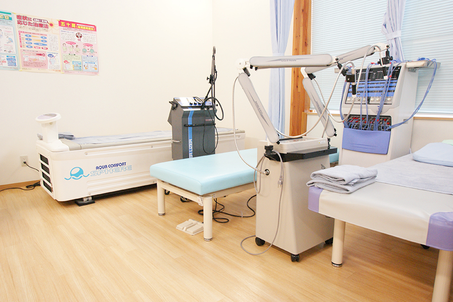 腰椎牽引器、ウォーターベッドによる全身マッサージ、乗るだけで振動効果により筋肉が増大する「G-Flex」などの最新のリハビリ機器を備え、専門スタッフによる機能回復訓練が受けられます。